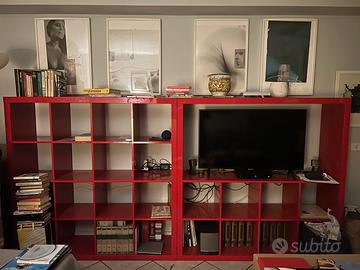 3 librerie rosso laccato, 1 con vano tv e una con 2 cassetti e 2 sportelli.