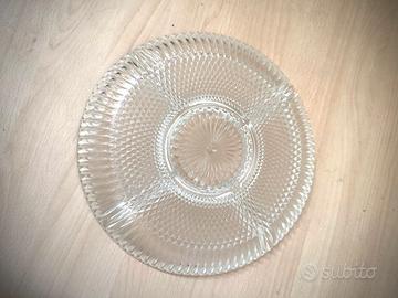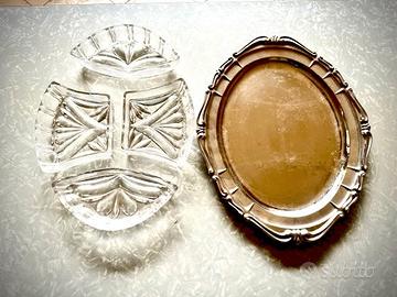 3 PIATTI PER CONTORNI E ANTIPASTI. COSI COMPOSTI: 1 TONDO IN VETRO DAL DIAMETRO DI CM 29 , 1 IN METALLO DA CM 37 X CM 29, E 1 IN VETRO DI CM 29 DIVISIBILE IN 4 PARTI .
