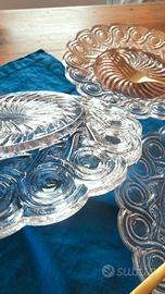 Tris di piatti vintage da frutta, realizzati in vetro trasparente lavorato a intrecci con raggiera centrale.