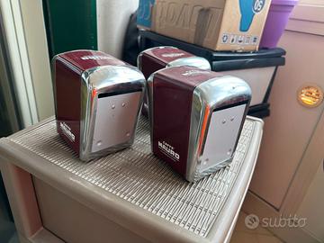Vendo un set di tre portatovaglioli vintage del famoso marchio di caffè italiano "Caffè Mauro". Questi portatovaglioli sono pezzi d'arredo perfetti per chi ama lo stile retro o per collezionisti di oggettistica da bar.