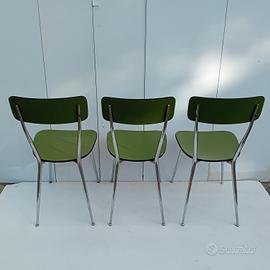 3 bellissime sedie in formica verdi perfette come complemento d'arredo per tantissime tipologie d'ambiente. Buonissime condizioni, normali segni dell'utilizzo e dell'età.