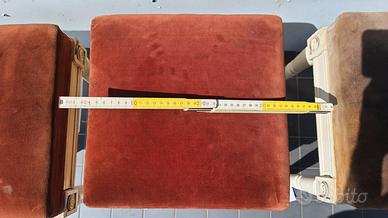Due sgabelli hanno la seduta imbottita di velluto di colore rosso scuro, il terzo sgabello ha la seduta di colore più scuro.