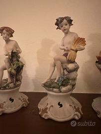 Elegante tris di statuine decorative in ceramica raffiguranti putti allegorici delle stagioni. Ogni figura è seduta su base decorata con motivi floreali e foro traforato frontale, dettagli finemente dipinti a mano.