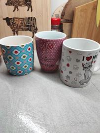 Set di 3 tazze in ceramica da circa 250 ml, tutte diverse: una con fantasia geometrica colorata, una stile vintage/retro rosa e una con grafica gattino “I love my cat”.