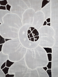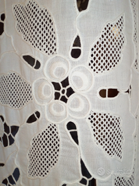 3 Tende in puro Cotone di colore Bianco con lavorazione intagliata, in Buonissime condizioni. Di datazione presunta anni 60/70. Lavorate con motivi Floreali, possono essere usate anche come copriletto o copritavola. Bellissime e particolari, arredano una stanza praticamente da sole.
