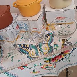 3 terrine colorate una oliera in confezione originale.3 bicchieri. e ciotola in vetro