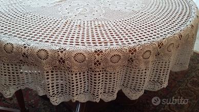 -COPRITAVOLO vintage, nuovo, molto elegante, in finissimo cotone bianco, lavorato a mano all'uncinetto, come un pizzo, per tavolo rotondo. Diametro cm 155 circa.