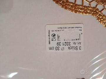 n. 10 confezioni da 3 centrini per torte (30 pz ), n. 5 dorati di diametro 33 cm (15 pz), n. 5 argentati di diametro 36 cm (15 pz). Nuovi, in confezioni originali. Si accetta pagamento PayPal. Spedizione in tutta Italia.