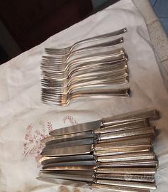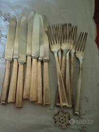 6 coltelli, 6 forchette, 6 cucchiai e 6 coltelli e 6 forchette da frutta/dolce in totale 30 pezzi con logo dell'hotel inciso sull'impugnatura.