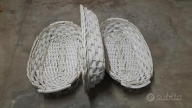 Vendo n. 3 cesti in vimini bianchi, utilizzati una sola volta per una festa, in pratica sono NUOVI!! Le dimensioni sono di 68x40x12cm. Resto a disposizione per altre info o foto.