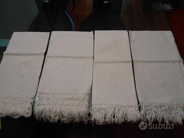 Vendo 4 asciugamani con frange e ricami in cotone di cui: 3 in lino e 1 in cotone con ricami e iniziali CG.