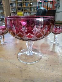Quattro bicchieri ed un alzatina in vetro rosso rubino con decorazioni satinate. In perfette condizioni.