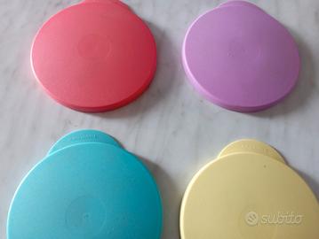 Vendo 4 bicchieri della Tupperware, molto capienti e leggeri dai colori giallo,lilla,verde,rosa, con i rispettivi coperchi . Lavati e riposti in un mobile.