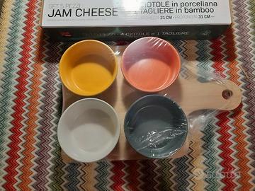 4 ciotole in porcellana diametro cm 10 con tagliere in bamboo