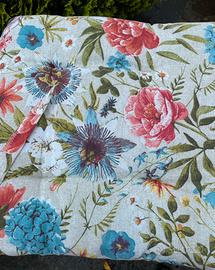 Bellissimi cuscini per sedia, perfetti per aggiungere un tocco di colore e comfort alla tua area relax. Sono realizzati in tessuto e presentano una stampa floreale multicolor su sfondo beige.