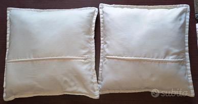 Vendo quattro cuscini quadrati (44x44cm), colore panna a fantasia, con rose (due gialle e due rosa), sfoderabili mediante cerniera posteriore. In perfette condizioni, nessun difetto.