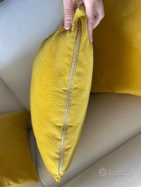 Cuscini velluto completi di fodera colore giallo in ottimo stato. 2 cuscini misura 40x40 e 2 cuscini 50x50 .