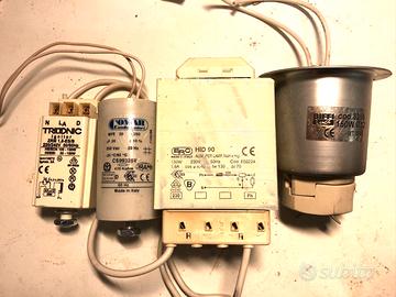 4 lampadine Philips agli ioduri metallici MASTERcolour CMD-T 150 W/830 a scarica di gas comprensive di trasformatori, accenditori, condensatori e portalampade come da foto. Disponibile per dettagli tecnici.