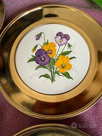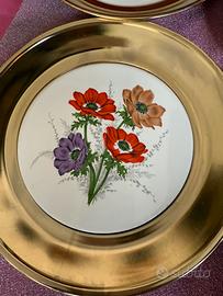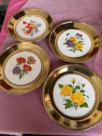 Vendo 4 graziosi piatti con bordo oro in materiale sintetico e pianella centrale in ceramica con motivo fiori . Ideali in cucina /salotto ma anche sotto ad un portico o nell'angolo relax del vostro balcone. Diametro 22 cm circa