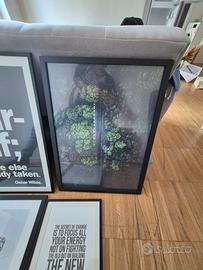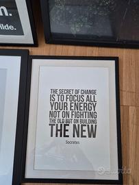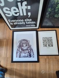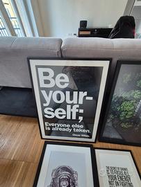 Quattro quadri con stampe decorative con cornice nera, dimensioni varie. Disponibili per ritiro a mano a Milano, zona Turro. dimensioni Be Yourself 52x71,5 cm Strada/bosco 50x70 cm Socrate in inglese 32x42 cm Scimmia 44x54 cm