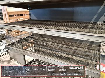 4 scaffalature espositive per merci usate, si tratta di quattro scaffalature carrellate in ottime condizioni di marca Wanzl a 4 ripiani con portata massima 50kg cad. adatte per riporre prodotto confezionati nei supermercati dotate di due ruote con freno. dimensioni: 133X88cm h170cm, vani 64/81cm una costa 200,00€ ma se le acquisti tutte spendi 700,00€