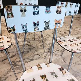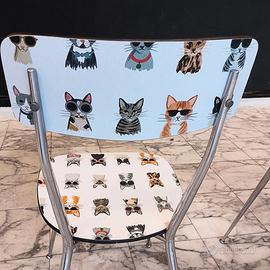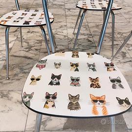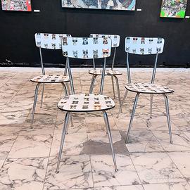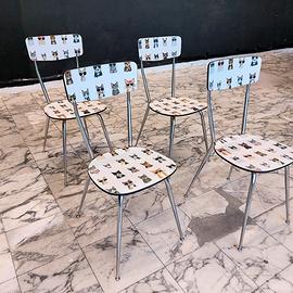 4 sedie in formica anni '70. Completamente trasformate e rimesse a nuovo: rivestite con carta particolare da parati (@cartadaparatideglianni70) e poi protette con vernice poliuretanica.