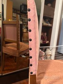 Nelle foto si vedono i dettagli di impunture e cuciture e gli intarsi del legno.