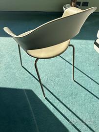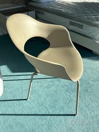 4 sedie di design con scocca avvolgente in tecnopolimero con un'ampia apertura sullo schienale, che funge anche da bracciolo. Gambe in metallo verniciate dello stesso colore. È un modello impilabile adatto sia per uso domestico che per ambienti contract o esterni.