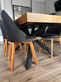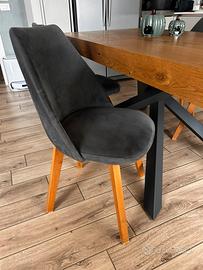 4 sedie con gambe in legno e seduta in velluto grigio scuro. Su alcune di esse, presenti piccole macchioline sulla seduta, ma nel complesso ancora in ottimo stato. Comprate da semeraro a 140€ l’una. Consegna a Rovato già smontate e impacchetate