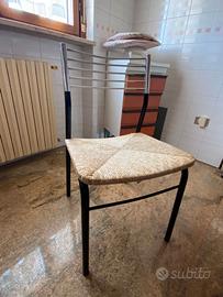 Vendo causa trasferimento Urgente n. 4 sedie, dal particolare modello elegante, molto robuste con struttura in acciaio, impagliate, marca Scavolini. Vendo anche tavolo con pratico piano in granito. Quest’ultimo presenta una piccola ammaccatura ad un angolo del piano sottostante in legno laminato, che comunque rimane coperto e perció invisibile. Entrambi gli oggetti sono acquistabili anche singolarmente. Ritiro in loco,