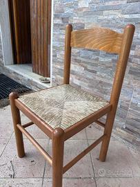 4 Sedie in legno con seduta in paglia – usata Sedia rustica in legno massello color noce medio, con seduta intrecciata in paglia/giunco in ottime condizioni. Il telaio presenta gambe tornite con traverse di rinforzo. Lo schienale è in legno con profilo curvo per un maggiore comfort. Solo ritiro castellaneta marina