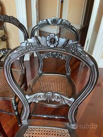Elegante gruppo di 4 sedie ottocentesche in legno massello scuro, finemente intagliate a mano nello schienale, con decori floreali e motivi vegetali.
