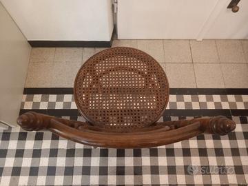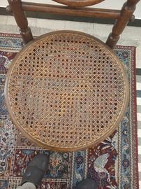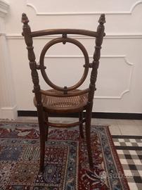Questa sedia è un esempio di sedia da bistrot in legno curvato prodotta da Fishel. Il design presenta una classica seduta in paglia di Vienna e uno schienale aperto con elementi circolari e torniture decorative. 70 euro cad. una.