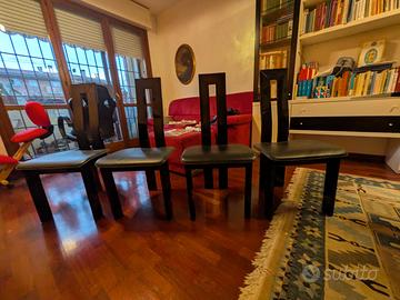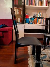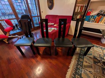 4 sedie design in legno nero laccato lucido con seduta in pelle.