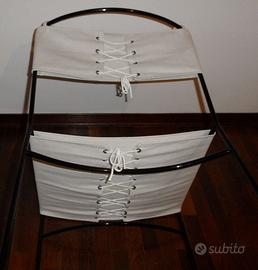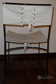 n. 4 sedie anni '70, marca Driade, modello Delfina. Struttura in robusto tondino di acciaio verniciato di nero a fuoco. Seduta e schienale in tela grezza beige. I teli sono originali, ma le cerniere sono state sostituite con lacci.