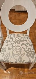 4 sedie, usate in sala da pranzo, legno massiccio bianco, seduta di stoffa a fiori argentati.