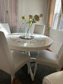 4 sedie in ecopelle bianca, gambe in legno massiccio colore bianco, schienale alto. Prezzo totale €20 (€5/sedia). Lieve usura invisibile su bordo superiore schienale.
