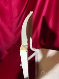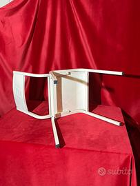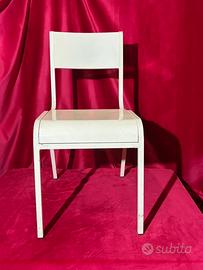 Sedie in lastra di metallo impilabili, prodotte dall’azienda F.lli De Santis di Montemiletto alla fine degli anni’70, su commissione dell’Esercito Italiano. Difficilmente reperibili in quanto non prodotte per essere destinate alla vendita, ma rigorosamente progettate e create solo per l’E.I. Ben conservate strutturalmente, ma con qualche segno presente sulla vernice a smalto. Su richiesta del cliente possono essere riverniciate ad aerografo con essicazione in forno, utilizzando il medesimo RAL.Restauro a parte. Dimensioni: H. 79,5 cm – L. 40 cm – P. 56 cm- H. seduta 43 cm – P. seduta 36 cm