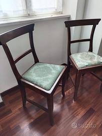 Quattro sedie in legno e tessuto. La struttura in legno delle sedie è in ottima condizione. I sedili (o sedute) delle sedie sono da ritappezzare. Una sedia è priva di sedile.