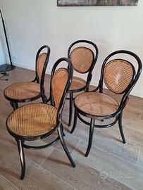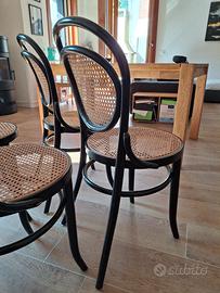 4 sedie in stile francesina originali anni '90, in legno dipinto di nero con schienale e seduta in rattan. ad una delle sedie va fatto aggiustare lo schienale di rattan. Vendo per cambio arredo. Ritiro solo a mano a Treviso città