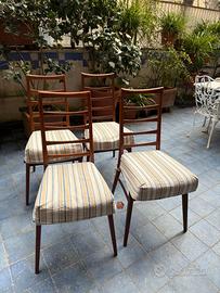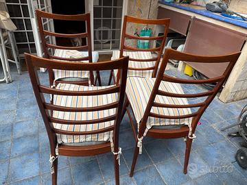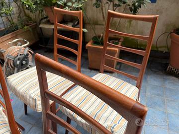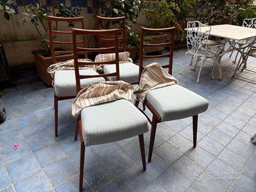 Quattro bellissime sedie danesi anni Sessanta modello LIS attribuite a Niels Koefoed, celebre designer. Come di consueto, non hanno marchi di attribuzione. Il modello LIS, nato nel 1961, era realizzato in teak o rovere massello (queste dovrebbero essere in rovere) nella fabbrica di Hornslet. Sono state recentemente revisionate da un falegname e tutte ritappezzate (anche per alzare l'imbottiture di alcuni centimetri; la seduta originaria in vinile non era presente quando le comprai). In eccellenti condizioni, lievi segni di uso sulle zampe.