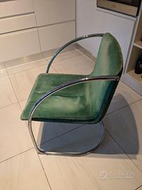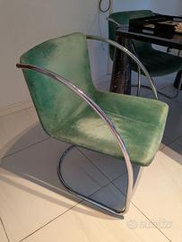 4 sedie di design anni '70 disegnate da giovanni offredi per saporiti italia, composte da una struttura in metallo cromato e da seduta e schienale imbottite e rivestite in stoffa. I Rivestimenti presentano alcune macchie.