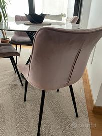 4 bellissime sedie di velluto rosa pari al nuovo, con i piedini neri. Le sedie si trovano a Milano e dovranno essere ritirate in loco