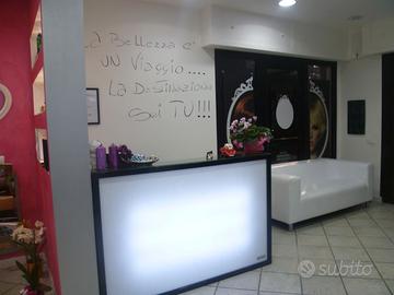 Banco reception con frontale retroilluminato a LED, struttura solida e finiture eleganti. La parte posteriore è attrezzata con cassetti e sportelli per una gestione ordinata. Perfetto per saloni di bellezza, barber shop e negozi.