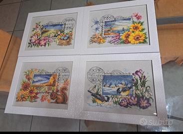 4 quadretti con ricamo realizzato a mano cornici in legno laccato bianco misura 20x25 cadauno prezzo trattabile