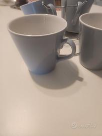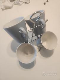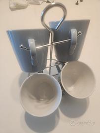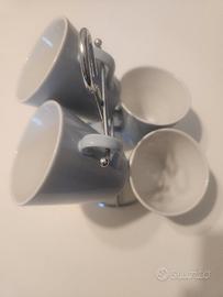 4 tazze grigie interne bianche con relativo supporto metallico.