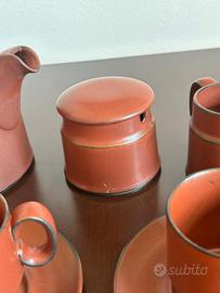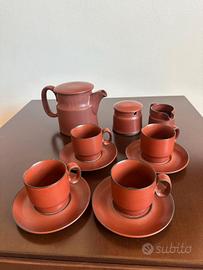 4 tazze complete di zuccheriera, bricco x il latte e bricco te/caffe’ in grès porcellanato marrone ( tazza h cm 7 diametro cm 7 piattino cm 15)