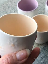 Quattro tazzine bianche con fiorellini in rilievo e tinta unita all’interno due rosa e due gialli