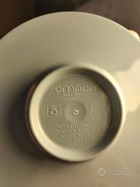 4 tazzine in vetro trasparente con 4 piattini colori assortiti in plastica 100% riciclata, prodotti dalla Omada made in Italy
