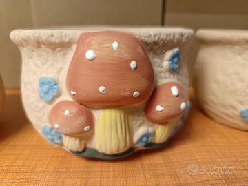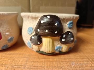 set di 4 vasetti in ceramica con decorazione funghi in rilievo dipinti. Azzurro -rosso-marrone-arancione.